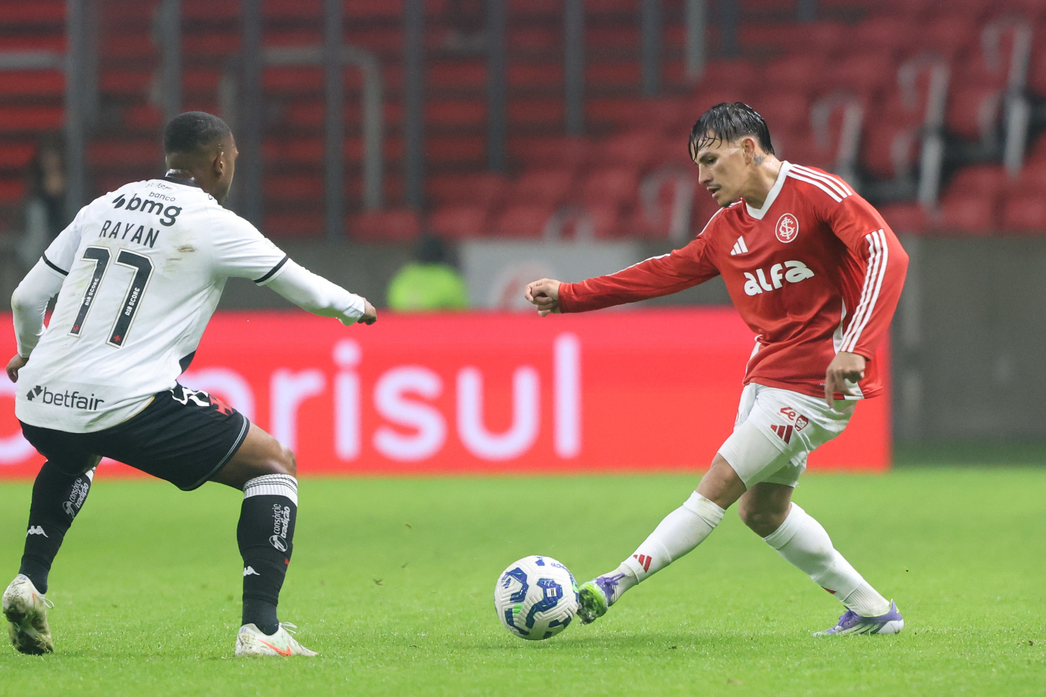 A persistência vascaína foi recompensada aos 29 minutos. Em um rápido contra-ataque, David recuperou a bola no campo de defesa, avançou e fez um passe preciso para Rayan. O jovem atacante invadiu a área e finalizou com precisão, entre as pernas do goleiro, abrindo o placar para o Vasco. Curiosamente, este não foi o primeiro gol de Rayan contra o Internacional; ele já havia balançado as redes coloradas em 2023, também fora de casa.
